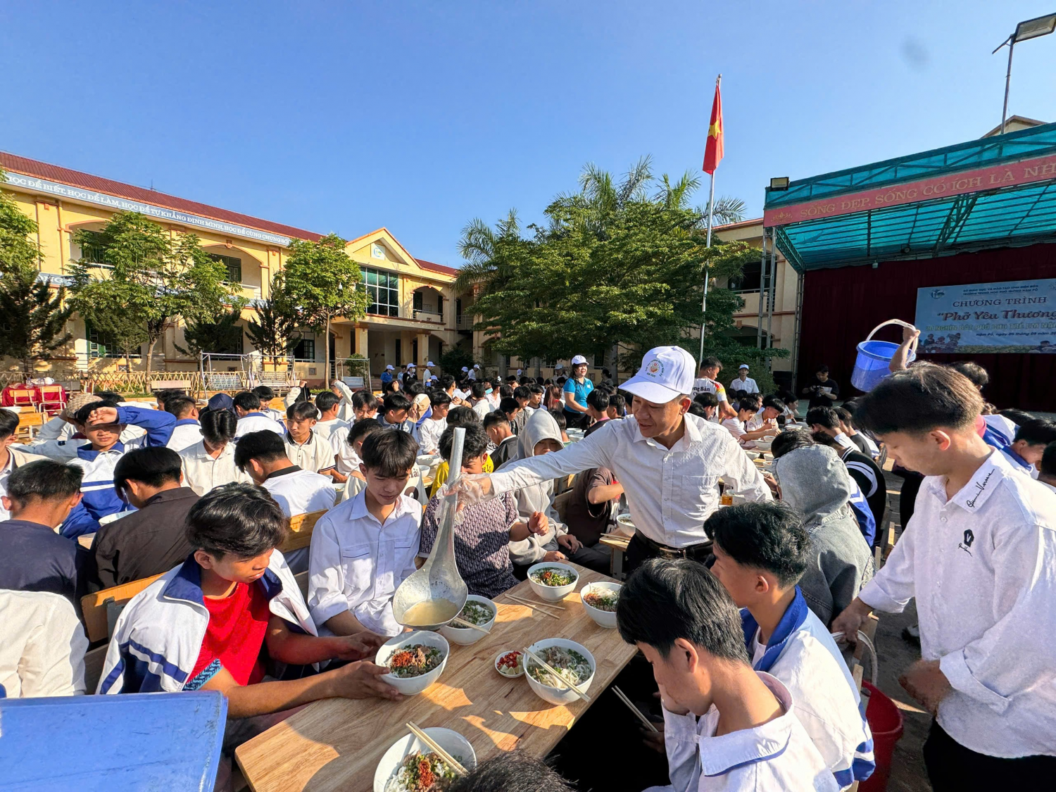 Chương trình “Phở yêu thương” mang đến hơn 700 suất phở nóng hổi, thơm ngon, được phục vụ ngay tại sân trường, trong một không gian thân thiện, cởi mở. Với các em học sinh – nhất là những em có hoàn cảnh đặc biệt khó khăn, thuộc hộ nghèo, cận nghèo – đây là một bữa ăn không chỉ có ý nghĩa về mặt dinh dưỡng, mà còn là sự sẻ chia đầy ấm áp từ những tấm lòng nhân ái. Mỗi bát phở là một câu chuyện, một thông điệp nhân văn về tình người, về trách nhiệm cộng đồng và niềm tin yêu dành cho thế hệ trẻ.