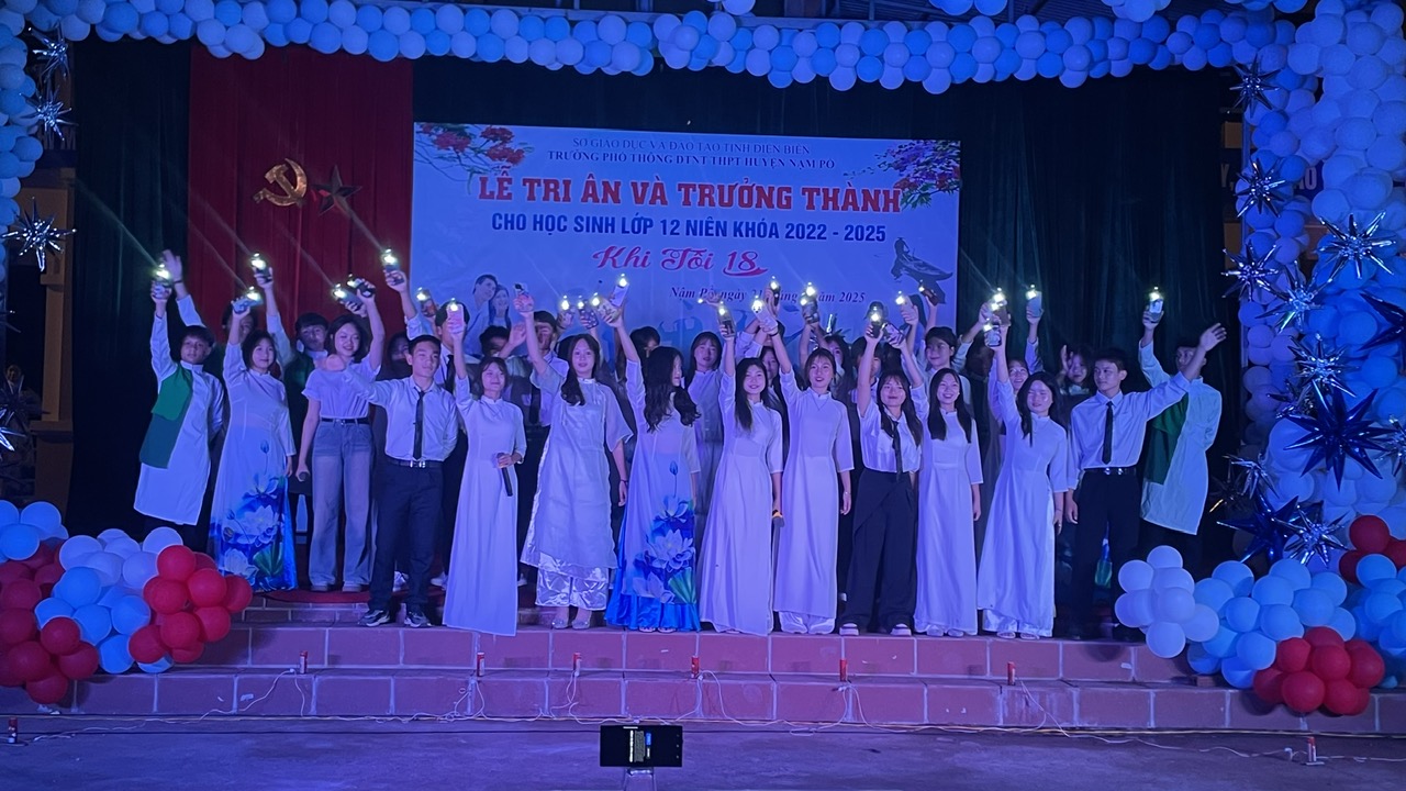 Buổi lễ kết thúc bằng một nghi thức thiêng liêng và vô cùng ấn tượng – khoảnh khắc các em học sinh lớp 12 cùng nhau cắt bánh sinh nhật mừng tuổi 18. Trong ánh nến lung linh và tiếng nhạc vang lên đầy cảm xúc, chiếc bánh sinh nhật không chỉ là món quà tượng trưng cho một tuổi mới, mà còn là lời khẳng định cho sự trưởng thành của các em – từ đây, chính thức bước sang một chặng đường mới với những hoài bão, khát vọng và trách nhiệm lớn lao. Những ước nguyện được thắp lên từ trái tim tuổi 18 – trong sáng, tràn đầy hy vọng – như những vì sao nhỏ lung linh giữa trời đêm Nậm Pồ tĩnh lặng. Thầy cô, cha mẹ, bạn bè – tất cả cùng chứng kiến và chúc phúc cho một thế hệ học trò đã sẵn sàng bước ra thế giới, mang theo hành trang là tình yêu thương, tri thức và lòng biết ơn vô tận.