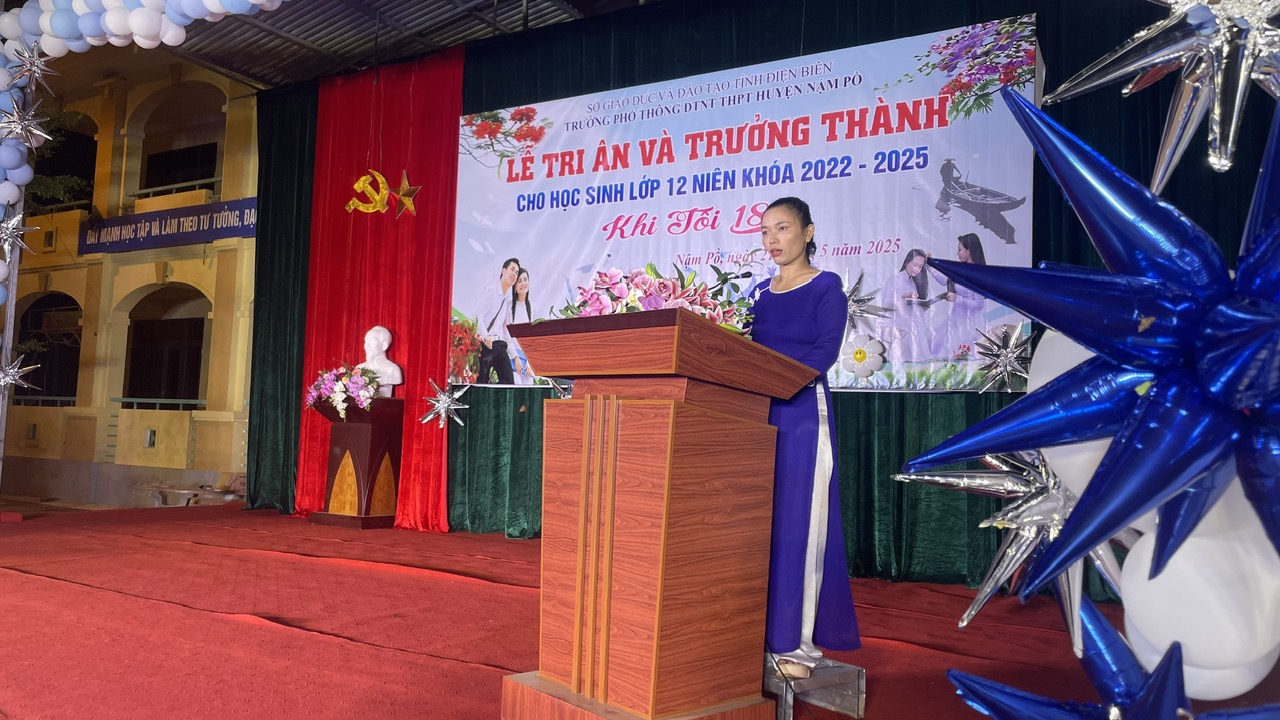 Tại buổi lễ, bác Lầu Thị Liên đại diện cho các bậc phụ huynh học sinh lớp 12, đã có bài phát biểu xúc động, gửi lời cảm ơn chân thành đến thầy cô – những người đã tận tụy gieo mầm tri thức, truyền lửa yêu thương và bản lĩnh sống cho các em trong suốt quãng đời học sinh.