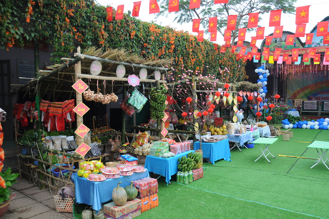 Hoạt động: Hội chợ xuân: được sự tham gia nhiệt tình của cha mẹ trẻ đã ủng hộ sản phẩm và làm 03 gian hàng từ các nguyên vật liệu sẵn có tại địa phương rất thân thiện, gần gũi với trẻ, giúp trẻ phát triển kỹ năng giao tiếp, kỹ năng sống, kỹ năng phối hợp. Đồng thời giúp trẻ thêm hiểu biết về những sản phẩm của nghề nông; khơi dậy tình yêu quê hương đất nước cho trẻ: