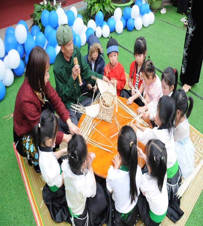 - Hoạt động nhà nông đua tài: Trẻ được quan sát, trải nghiệm nghề đan lát do nghệ nhân Lò Văn Nọi hướng dẫn. Qua hoạt động trẻ biết được nghề đan lát là nghề thủ công truyền thống lâu đời tại Việt Nam, sử dụng nguyên liệu tự nhiên như mây, tre, nứa, giang để tạo ra các vật dụng gia đình (thúng, mủng, rổ, rá, gùi). Là nét văn hóa đặc sắc, đặc biệt phổ biến trong đời sống các dân tộc thiểu số như dân tộc Thái, dân tộc Kháng, không chỉ phục vụ nhu cầu sinh hoạt mà còn là sản phẩm hàng hóa, quà lưu niệm, mang lại thu nhập và giữ gìn văn hóa: