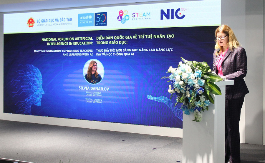 Phát biểu tại diễn đàn, bà Silvia Danailov, Trưởng đại diện UNICEF tại Việt Nam khẳng định: “Chúng tôi cam kết đảm bảo rằng trí tuệ nhân tạo được sử dụng một cách có đạo đức, có trách nhiệm và có tính hòa nhập - với trọng tâm là công bằng, bảo vệ trẻ em và sức khỏe số. Cùng nhau, chúng ta có thể xây dựng một hệ thống giáo dục nơi mọi giáo viên đều được trao quyền, mọi học sinh đều được chuẩn bị sẵn sàng, và không một trẻ em nào bị bỏ lại phía sau.”