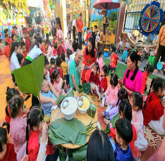 Tiếp nối là hoạt động trải nghiệm như gói bánh chưng, bên cạnh đó các con còn được thể hiện năng khiếu của mình với các hoạt động như dán tranh mùa xuân, nặn tò he, chơi trò chơi dân gian ô ăn quan, …