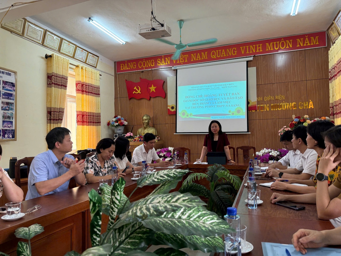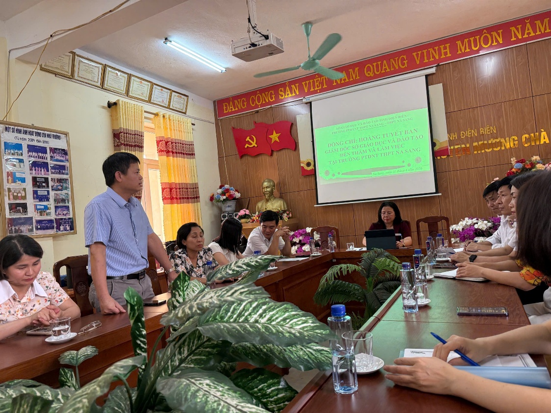 Phát biểu tại buổi làm việc, đồng chí Hoàng Tuyết Ban- Ủy viên Ban Chấp hành Đảng bộ tỉnh, Giám đốc Sở Giáo dục và Đào tạo tỉnh Điện Biên đã ghi nhận và biểu dương những nỗ lực của tập thể cán bộ, giáo viên nhà trường trong thời gian qua. Đồng chí đánh giá cao tinh thần trách nhiệm, sự cố gắng vượt khó của đội ngũ giáo viên trong việc duy trì sĩ số, nâng cao chất lượng giáo dục và chăm lo đời sống học sinh nội trú.