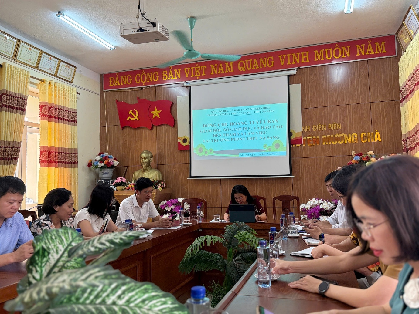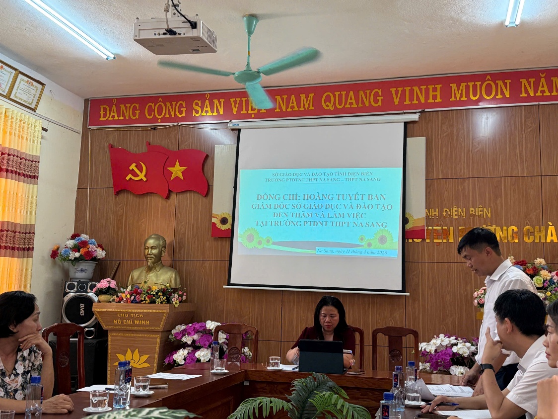 Thực hiện chương trình công tác của Sở Giáo dục và Đào tạo tỉnh Điện Biên, chiều ngày 11/4/2026, đoàn công tác do đồng chí Hoàng Tuyết Ban – Ủy viên Ban Chấp hành Đảng bộ tỉnh, Giám đốc Sở Giáo dục và Đào tạo tỉnh Điện Biên làm Trưởng đoàn đã đến thăm và làm việc tại Trường PTDTNT THPT Na Sang, xã Na Sang. Cùng tham gia đoàn có các đồng chí chuyên viên của Sở Giáo dục và Đào tạo tỉnh Điện Biên. Về phía các nhà trường có Ban Giám hiệu, các tổ trưởng chuyên môn của Trường THPT Na Sang và Trường PTDTNT THPT Na Sang.