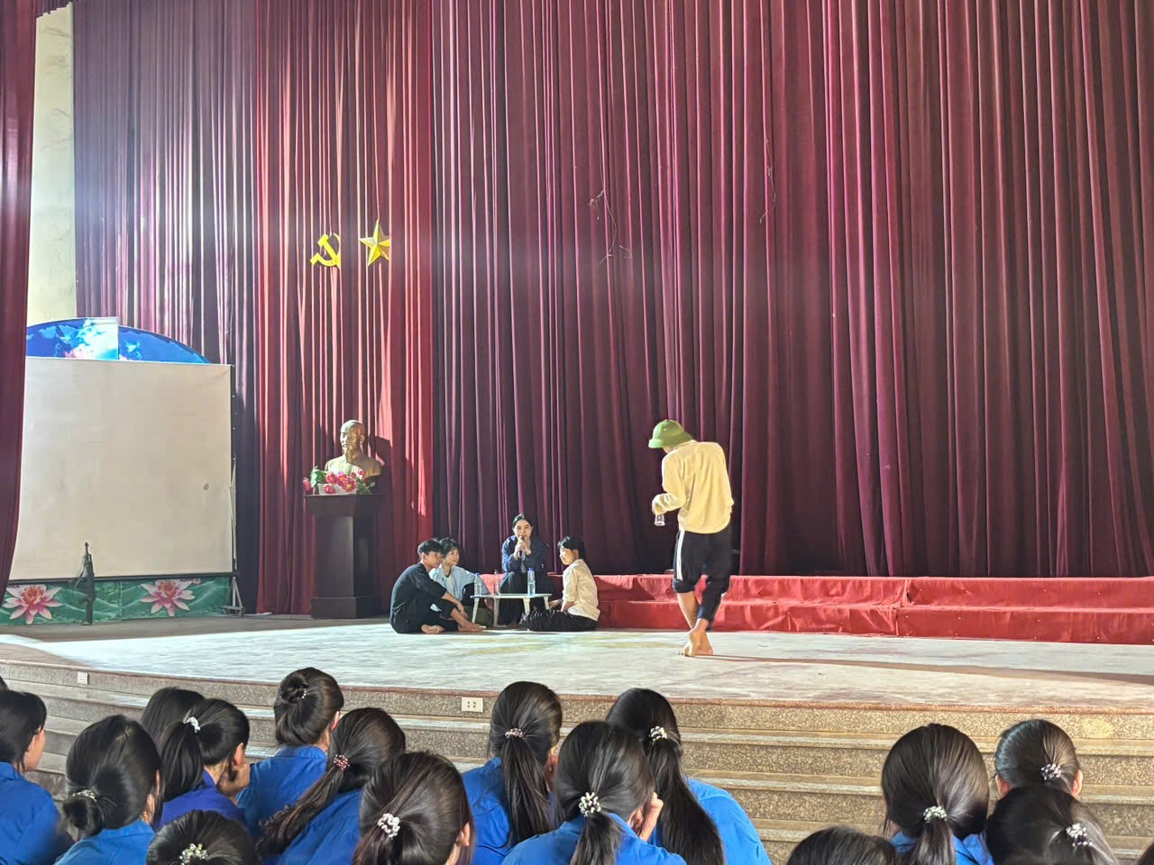 Điểm nhấn bùng nổ và lấy đi nhiều cảm xúc nhất của ngày hội chắc chắn thuộc về màn hóa thân xuất thần của các "diễn viên không chuyên" khối 10! Hưởng ứng thông điệp kết nối tri thức của Ngày Sách 2026, các bạn ấy đã dùng sự sáng tạo để "hô biến" những nhân vật kinh điển bước thẳng từ trang sách lên bục sân khấu. Cả hội trường đã thực sự lặng đi trước nội tâm đầy ám ảnh của Chí Phèo, rồi lại vỡ òa tự hào cùng lòng dũng cảm, lạc quan của ba cô gái trong Những ngôi sao xa xôi. Bằng sự đầu tư nghiêm túc từ trang phục, diễn xuất ấn tượng và lối dẫn chuyện truyền cảm, các lớp không chỉ mang đến những tiết mục mãn nhãn mà còn khoe khéo khả năng làm việc nhóm cực đỉnh. Hơn cả một sân chơi nghệ thuật, đây là cách tuyệt vời nhất để các bạn thấu hiểu tác phẩm, tự tin thể hiện bản thân và lan tỏa tình yêu văn học một cách tự nhiên, rực rỡ nhất.
