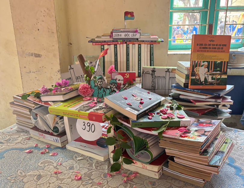 Điểm nhấn của Ngày hội là chuỗi hoạt động phong phú, sáng tạo, thu hút sự tham gia tích cực của học sinh các khối lớp. Đối với học sinh khối 12, hoạt động xếp sách nghệ thuật và giới thiệu mô hình đã mang đến những tác phẩm vô cùng độc đáo và mang đậm tinh thần tự hào dân tộc. Từ những cuốn sách quen thuộc, các em đã khéo léo và tỉ mỉ tái hiện lại thời khắc lịch sử hào hùng qua hình ảnh chiếc xe tăng đang dũng mãnh húc tung cánh cổng Dinh Độc Lập. Đặt ngay sát biểu tượng chiến thắng vẻ vang ấy là một khối sách đồ sộ, được xếp chồng vững chãi, tượng trưng cho kho tàng tri thức vô tận của nhân loại. Sự kết hợp đầy tính nghệ thuật này không chỉ bộc lộ tư duy sáng tạo tuyệt vời của các lớp mà còn truyền tải thông điệp sâu sắc: trân trọng nền hòa bình, độc lập của Tổ quốc và dùng sức mạnh của tri thức để tiếp tục kiến thiết, phát triển đất nước.