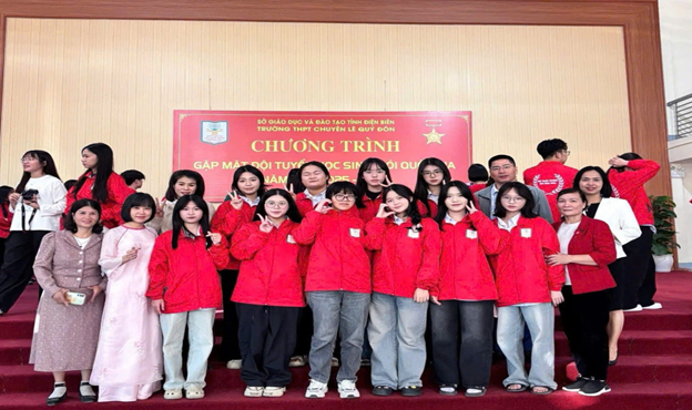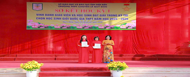 Cô giáo Phạm Thu Hằng (đứng giữa) trong lễ Sơ kết học kỳ I – Vinh danh GV và HS đạt giải trong kỳ thi chọn HSGQG 2025-2026