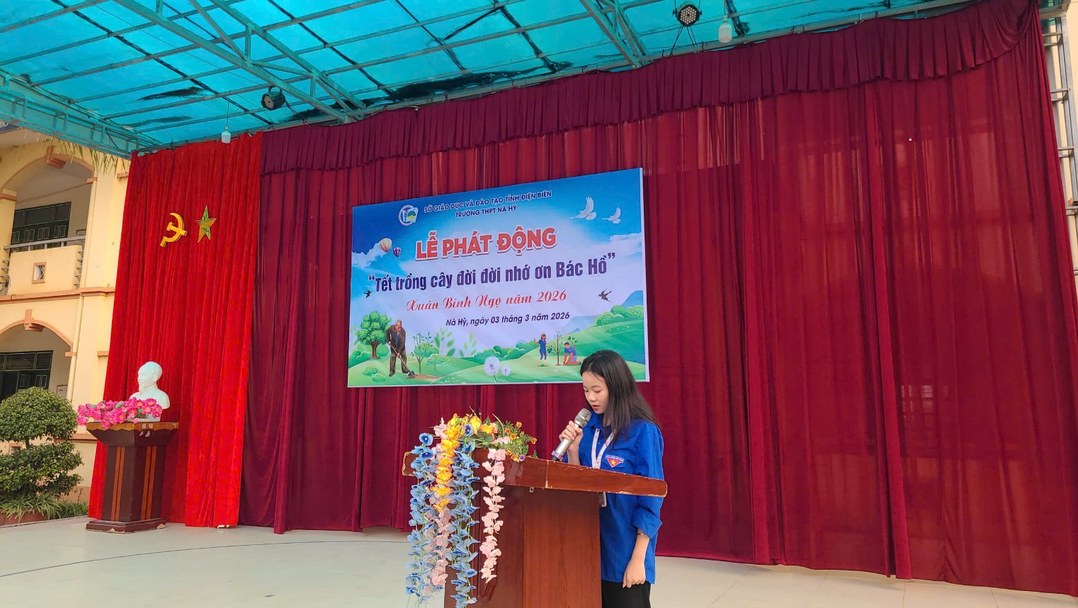 Hòa trong không khí thi đua sôi nổi những ngày đầu xuân Bính Ngọ 2026, Sáng ngày 03/03/2026 Trường THPT Nà Hỳ đã tổ chức Lễ phát động “Tết trồng cây đời đời nhớ ơn Bác Hồ” với sự tham gia của toàn thể cán bộ, giáo viên, nhân viên và học sinh toàn trường. Hoạt động mang ý nghĩa thiết thực, góp phần giáo dục truyền thống, nâng cao ý thức bảo vệ môi trường và xây dựng cảnh quan sư phạm xanh – sạch – đẹp. Buổi lễ được tổ chức trang trọng tại sân trường. Sau khi ổn định tổ chức, chương trình bắt đầu bằng nghi thức chào cờ nghiêm túc, thể hiện tinh thần kỷ luật và niềm tự hào của tập thể nhà trường. Phần tuyên bố lý do, giới thiệu đại biểu đã nêu bật mục đích, ý nghĩa của phong trào “Tết trồng cây” – một hoạt động do Chủ tịch Hồ Chí Minh khởi xướng và đã trở thành nét đẹp văn hóa đầu xuân của dân tộc.