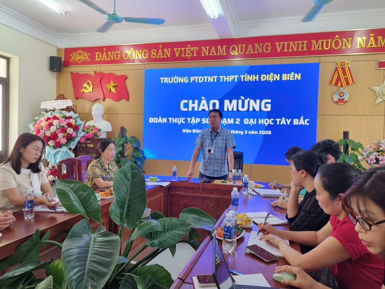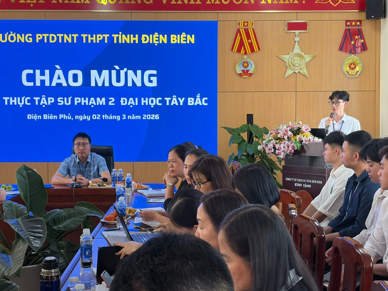 Thực hiện Kế hoạch tổ chức Thực tập sư phạm 2 cho sinh viên khóa K63 của Trường Đại học Tây Bắc, chiều ngày 02/3/2026, Trường PTDTNT THPT tỉnh Điện Biên đã tổ chức chương trình tiếp nhận và gặp mặt đoàn sinh viên thực tập sư phạm tại phòng Hội đồng nhà trường. Tham dự buổi gặp mặt có Ban Giám hiệu nhà trường, các tổ trưởng chuyên môn, giáo viên hướng dẫn cùng toàn thể các thầy cô giáo trong Hội đồng sư phạm. Về phía đoàn thực tập có 26 sinh viên Trường Đại học Tây Bắc tham gia thực tập sư phạm 2 tại nhà trường trong thời gian theo kế hoạch.